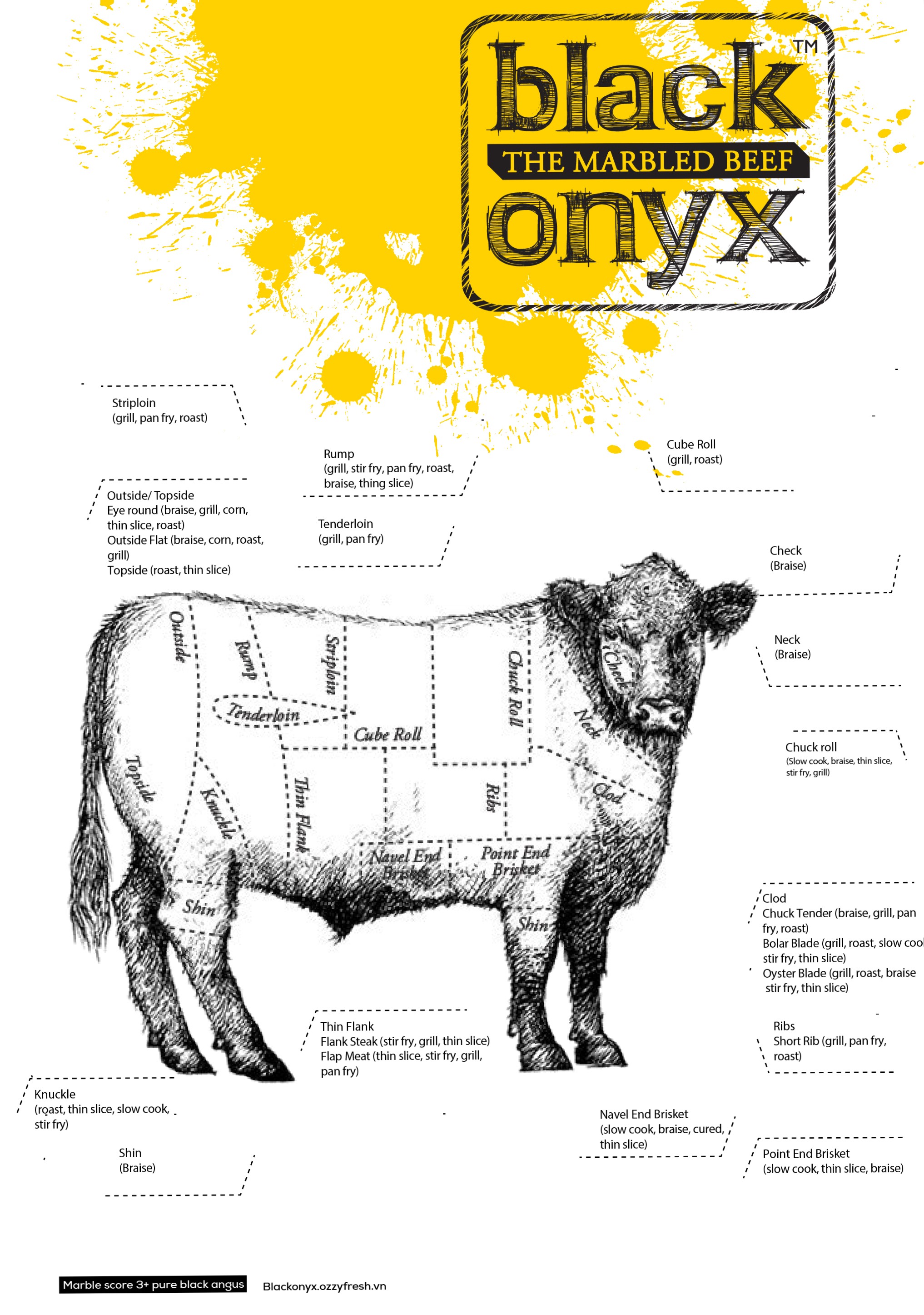 Phía trên là sơ đồ về các phần thịt trên một con bò Úc Vân Cẩm Thạch và cách chế biến phù hợp cho mỗi loại thịt đó để có một món ăn thơm ngon hoàn hảo.